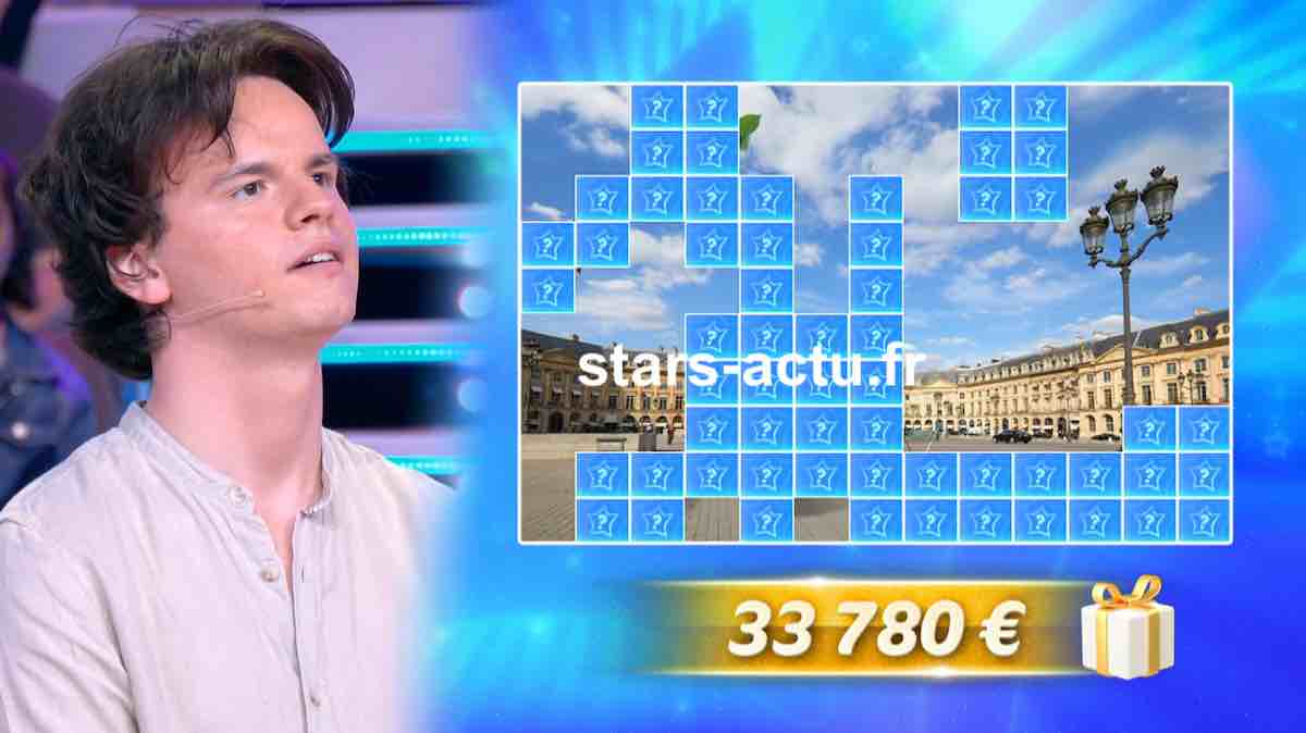 Cyprien fait ainsi monter sa cagnotte au total de 84.888 euros de gains et cadeaux. Du côté de l’étoile mystérieuse, toujours rien de plus en dehors de la photo de fond, il s’agit de la place Vendôme, à Paris. Un nouvel indice commence à apparaitre en haut, il s’agit de feuilles mais difficile de savoir de quoi pour l’instant.